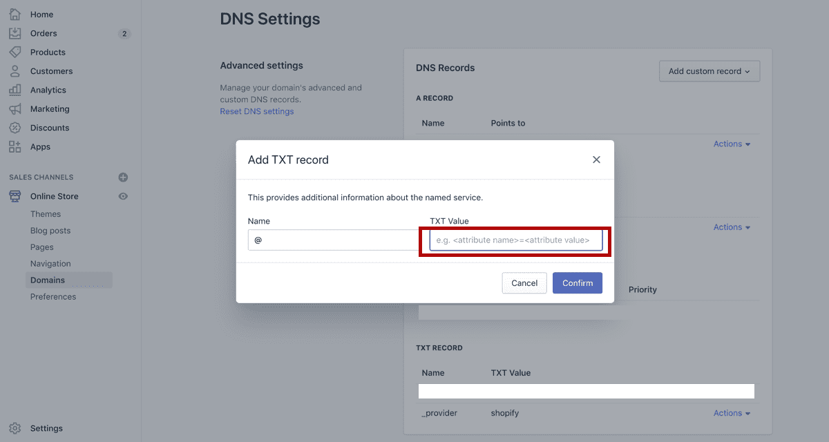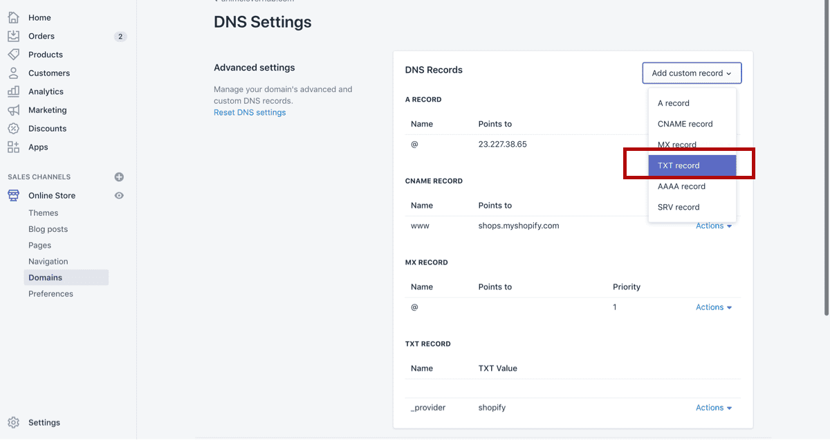 Add a Custom Record > TXT Record