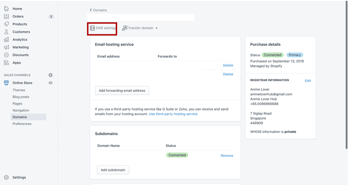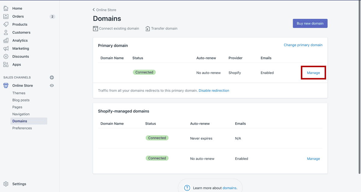 Head back to your Shopify Portal. Go under Online Store > Domains.