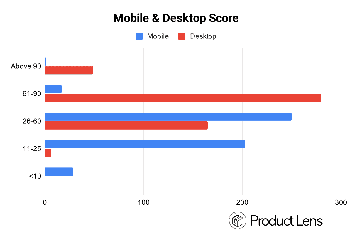 Mobile tends to score 59% lower than Desktop.